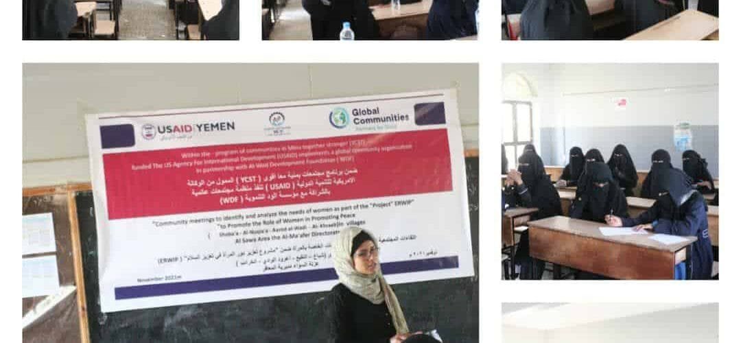 إختتمت الود التنموية اليوم الخميس الموافق 2021/12/30 ورشة العمل التدريبية ( لإعداد اللوائح المنظمة والخطة الاستراتيجية لملتقى السلام النسوي بمديرية المعافر) ضمن مشروع تعزيز دور المرأة في تعزيز السلام الممول من الوكالة الامريكية للتنمية الدولية ( USAID ) والتي تنفذها مؤسسة الود التنموية ( WDF ) بالشراكة مع منظمة مجتمعات عالمية ( Global Communities )