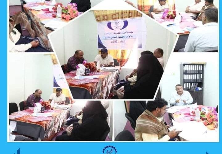 عقد مجلس أمناء مؤسسة الود التنموية اجتماعه السنوي برئاسة رئيس المجلس أ / خالد القاضي وذلك للوقوف على أهم المشاريع التي حققتها المؤسسة خلال العام المنصرم 2020 وما حققته المؤسسة في إطار الاستراتيحية والخطة التشغيلية والموازنة للعام الحالي 2021 كما جرى التطرق إلى بعض الملاحظات الواردة في تقرير الأداء والموازنة للعام الماضي والعام الجاري 2021 والتأكيد على مراعاة العمل بالملاحظات عند الأداء للفتره المتبقية من هذا العام وعند اعداد الخطه التشغيلية والموازنة للعام القادم 2022 ..