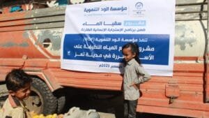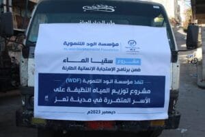 |      الود تدشن  مشروع سقيا الماء في مدينة تعز . 6/ديسمبر 2023 دشنت مؤسسة الود التنموية (WDF) اليوم المرحلة الأولى من مشروع سقيا الماء في مدينة تعز ضمن برنامج الاستجابة الإنسانية الطارئة وذلك بتوزيع 20,000 لتر من المياه النظيفة على الأسر المتضررة في مدينة تعز. جاء هذا المشروع استجابة لنقص الحاد في إمدادات المياه النظيفة في المدينة ، ويعكس مدى التزام المؤسسة في تحسين حياة الناس وتلبية احتياجاتهم الأساسية والحفاظ على صحتهم والوقاية من الأمراض المنقولة عن طريق المياه. مؤسسة الود شركاء في التنمية وبناء الإنسان Al-wed launches a water irrigation project in the city of Taiz. Today, 6/December 2023 the Al-Wed Development Foundation (WDF) launched the first phase of the water irrigation project in the city of Taiz as part of the emergency humanitarian response program. By distributing 20,000 liters of clean water to affected families in the city of Taiz. This project came in response to the acute shortage of clean water supplies in the city, and reflects the Foundation’s commitment to improving people’s lives, meeting their basic needs, preserving their health, and preventing waterborne diseases. Al-Wed Foundation Partners in development and human building  |