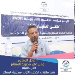 | مدير عام المعافر المشمر .. يحضر تدشين “ملتقى الخطباء الأول” بالمديرية الخميس 20 يوليو إدارة_إعلام_ديوان_عام_مديرية_المعافر حضر مدير عام مديرية المعافر رئيس المجلس المحلي الأستاذ عادل المشمر صباح اليوم في قاعة الصفاء بالنشمة تدشين ملتقى الخطباء الأول لتعزيز التماسك الاجتماعي وبناء السلام هذا وتحت شعار”نحو خطاب ديني يعزز التماسك المجتمعي وبناء السلام المستدام ” أقامت مؤسسة الود التنموية (WDF) ملتقى الخطباء الأول لمناصرة قضايا السلام والتنمية والإستقرار المجتمعي في مديرية المعافر ، والذي يهدف إلى رفع مستوى الخطاب الديني الموجه لقضايا المجتمع وتعزيز التماسك الاجتماعي . في مستهل اللقاء وبعد النشيد الوطني رحب المدير التنفيذي لمؤسسة الود أ.عبدالكريم السالمي في كلمته بكل الحاضرين ، كما أستعرض برنامج الملتقى وأشار إلى أهميته ودور الخطباء في تلمس ومعالجة قضايا الناس ومواكبة التطورات والاحداث المتسارعة ، وضرورة توحيد الخطاب الداعم للوحدة والإصطفاف الجمهوري . مشيرا إلى أن هناك لقاء أخر للخطباء والمرشدين الاجتماعين لبقية عزل المديرية يوم السبت القادم في عزلة الشعوبة استهدف الملتقى الأول (80) خطيب ومرشد اجتماعي وعدد من الوجهاء والقيادات الحزبية والسياسية . مدير عام المديرية المشمر في كلمته التوجيهية رحب بالجميع وعبر عن ارتياحه بهذا الملتقى الذي يضم عددا من الخطباء والقيادات المجتمعية والسياسية .. وأكد “أن هذا الملتقى بادرة خير وحلقة وصل بين السلطة المحلية والخطباء والمرشدين الاجتماعيين من جهة وبين المجتمع المحلي من جهة أخرى لخلق وعي مجتمعي للتعايش وبناء السلام .. ويعزز توجهات السلطة المحلية بالمديرية التنموية.. ، كما وجه المشمر الخطباء بإنشاء منصة تواصل معهم وذلك من أجل مساندة السلطة المحلية في تقديم العون ورفع الوعى المجتمعي في العديد من القضايا المجتمعية التي تأثر بشكل مباشر على النسيج الاجتماعي وتعيق مسار التنمية ، وحث الملتقى على ضرورة الحضور في الواقع .. كما تقدم بشكره لمؤسسة الود أقامت هذا الملتقى متمنيا تنفيذ المزيد من الأنشطة والمشاريع التنموية بالمديرية وأكد أن السلطة المحلية بالمديرية ستعمل على تذليل الصعوبات والعوائق أمام المؤسسة وكل المنظمات لتنفيذ المشاريع والتدخلات التنموية بالمعافر .